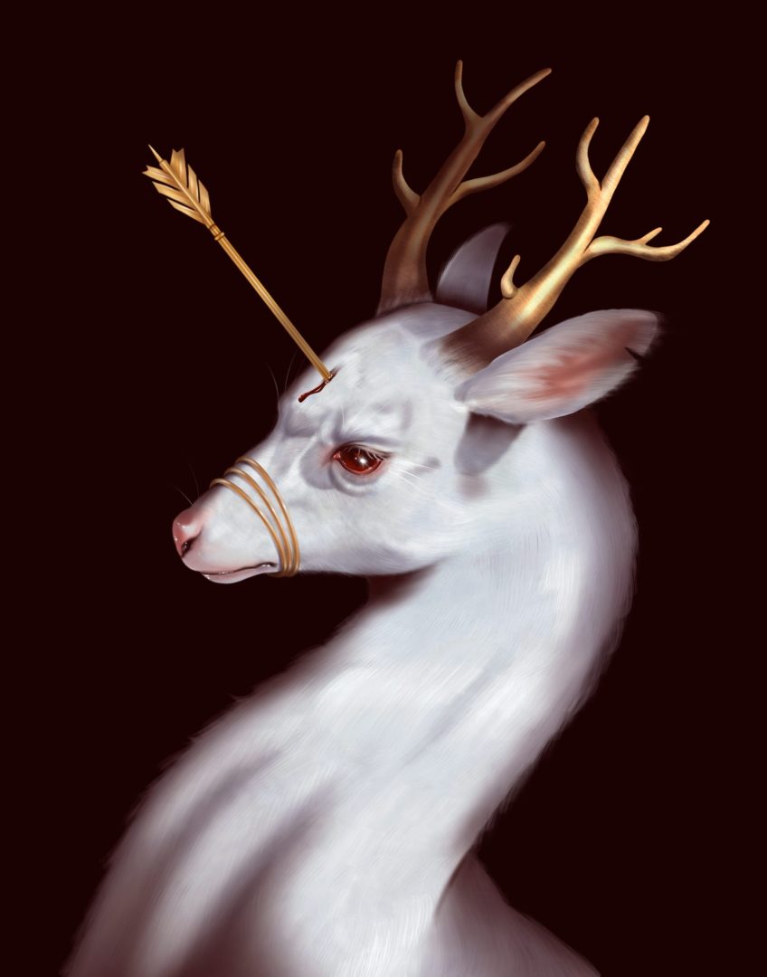 Rad se bavi idejom da izuzetnost ili posebnost, umjesto da bude prepoznata kao dar, često izaziva osudu ili napad. Prikazuje bijelog jelena koji sibolizira čistoću i slobodu. Posebno se istiću zlatni motivi, prvobitno rogovi koji upućuju na posebnost te životinje koji je ujedno čine metom.