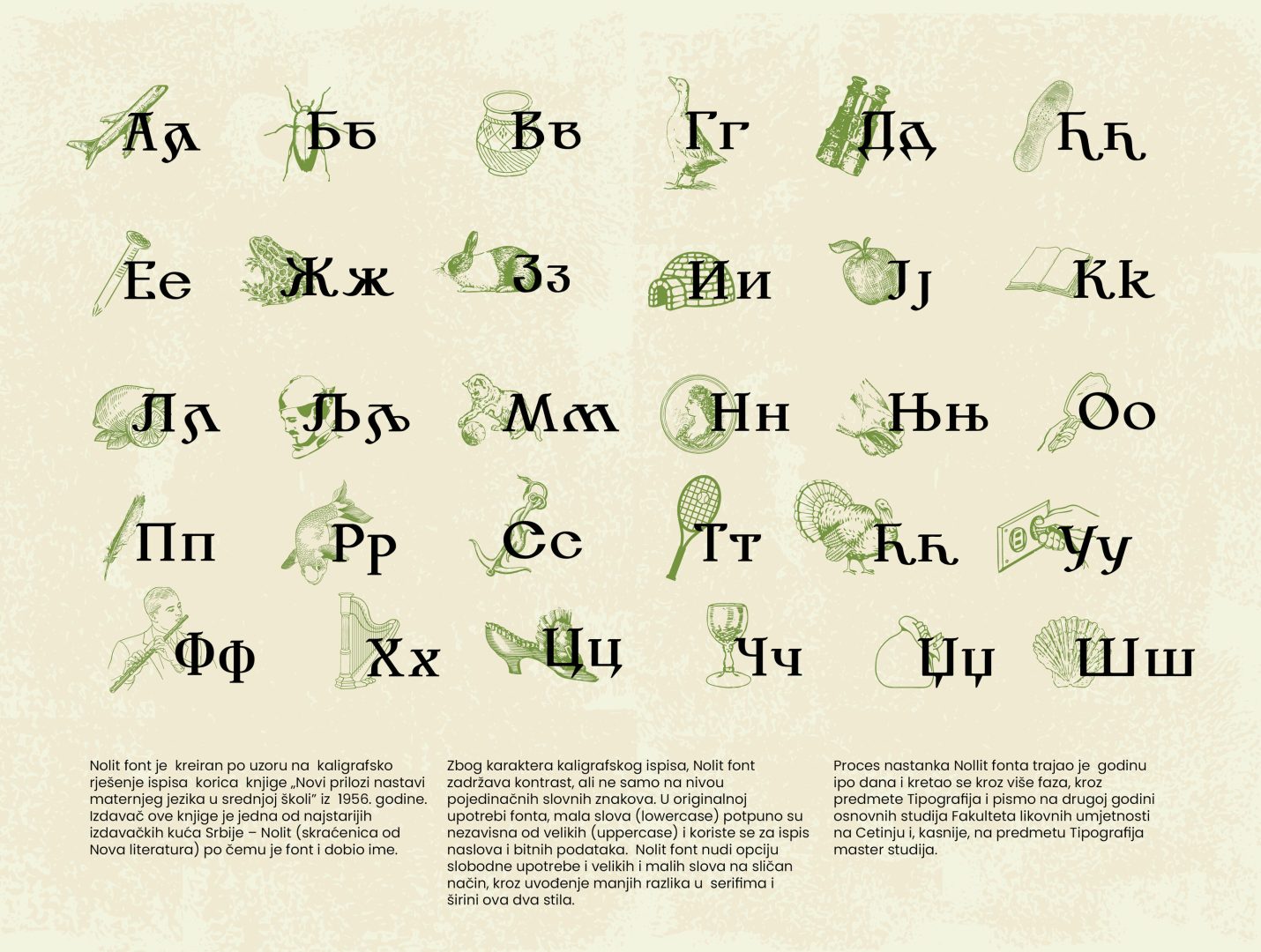 Nolit font je kreiran po uzoru na kaligrafsko rješenje ispisa korica knjige „Novi prilozi nastavi maternjeg jezika u srednjoj školi” iz 1956. godine. Izdavač ove knjige je jedna od najstarijih izdavačkih kuća Srbije – Nolit (skraćenica od Nova literatura) po čemu je font i dobio ime.
